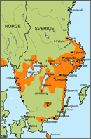 Klicka för större bild! är en virussjukdom som orsakar inflammation i hjärnan. Smittan överförs direkt i samband med fästingbettet. Sjukdomen förekommer under vår, sommar och höst huvudsakligen i Stockholms län, Uppland och Södermanland, men även i delar av Västergötland samt i flera län i södra Sverige (se översiktkarta). Även på Åland förekommer TBE.